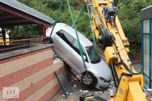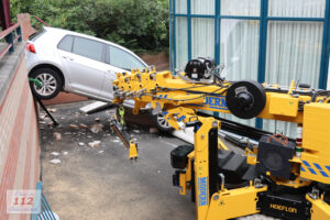 Een bergingsbedrijf werd ingeschakeld maar omdat het een binnenplaats betrof en een groot bergingsvoertuig niet de binnenplaats op kon werd er een speciale kraan opgeroepen. Deze kraan is smal maar kon toch de auto veilig omhoog takelen waarna de auto naar achteren werd getrokken. Het voertuig is vervolgens afgesleept door de berger.