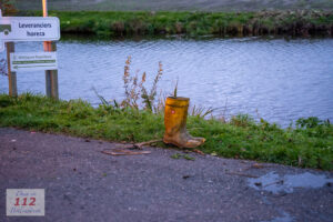 Een voorbijganger had twee laarzen op z’n kop in het water aangetroffen en daar melding van gemaakt. De meldkamer heeft dit serieus opgepakt, zoals het hoort, en er melding persoon te water van gemaakt.