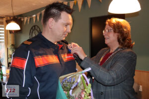WARMOND – Burgemeester Carla Breuer heeft zaterdagmiddag 24 januari twee speldjes uitgereikt op de korpsmiddag-/avond bij brandweer Warmond. De brandweer organiseerde deze dag in een zaal aan het Oosteinde in Warmond. Ploegchef van brandweer Warmond Rob van Duyn hield een speech en blikte onder andere terug op het afgelopen jaar. Vervolgens kwamen burgemeester Carla Breuer en Hans Zuidijk (directeur en Regionaal Commandant Brandweer Hollands-Midden) aan het woord.